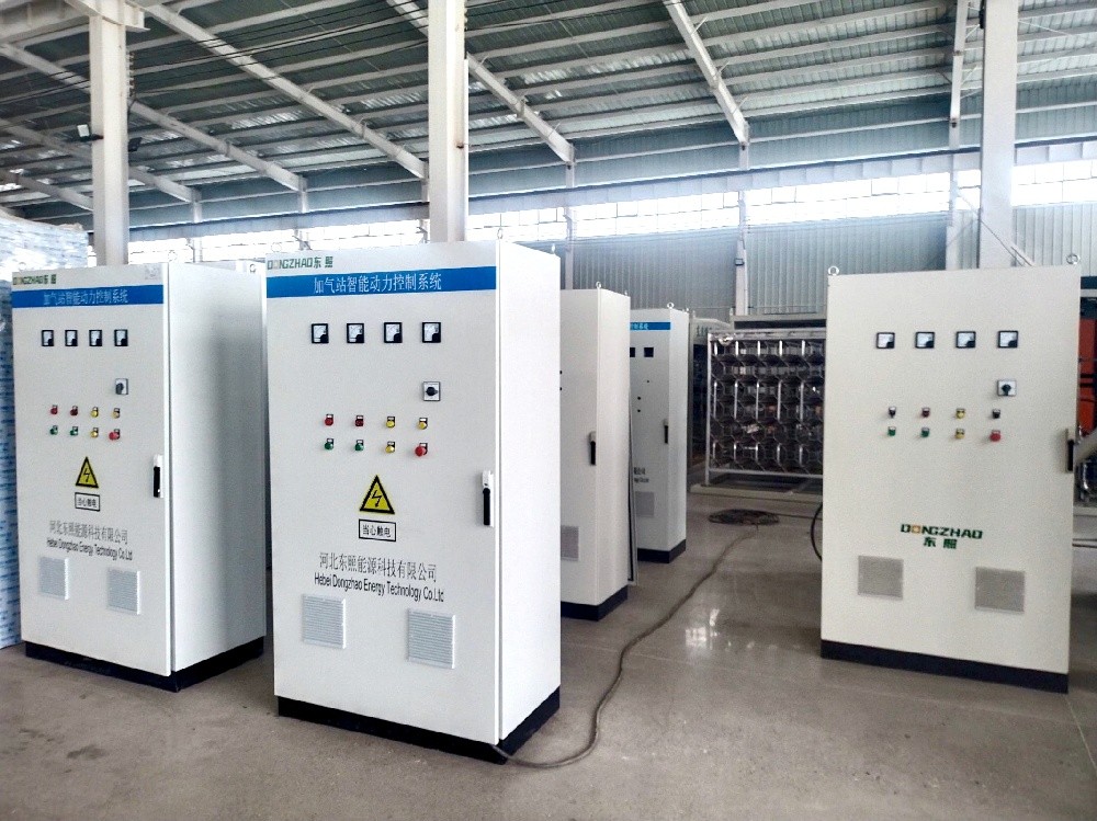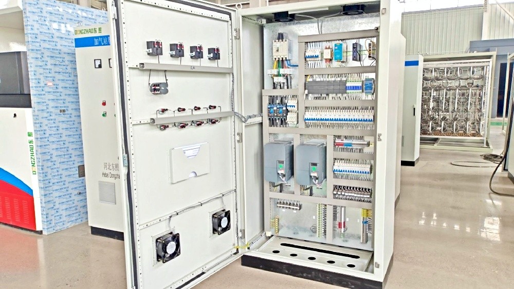 电控柜作为加气站的主要控制部分由PLC、变频器/软启动、中间继电器、安全栅/隔离栅、开关电源、空开、接线端子以及按钮开关、柜体等组成。本公司所有电控柜均自己组装,PLC为西门子的Smart200系列,变频器采用ABB产品,中间继电器采用施耐德或欧姆龙产品,其他元器件均为国内知名品牌产品,确保组配的控制柜质量可靠、运行稳定。